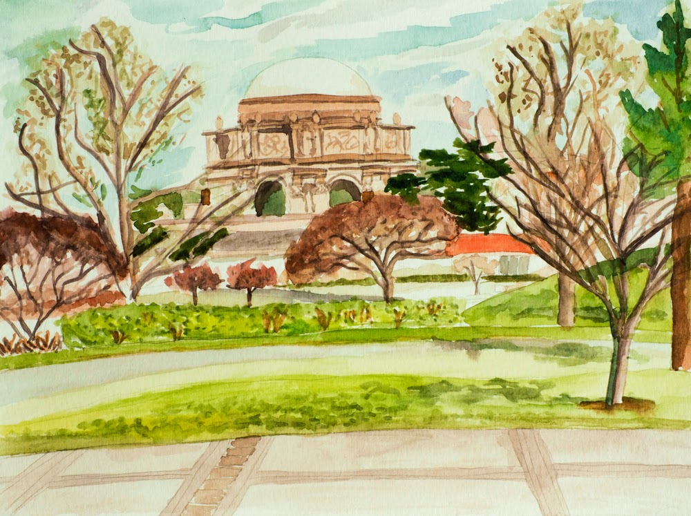 In the distance was the gorgeous Palace of Fine Arts dome. From where I was sitting, I could see only the upper half and part of a colonnade. Trees and other buildings obscured the rest. I thought that the combination of the palace in the distance and the nature and buildings in front would make for an interesting composition.
