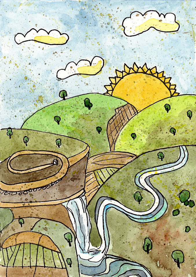House Over Waterfall By Audrey M. Roy Greenfeld • Sun, May 10, 2015 A third piece inspired by Tolkien's artwork. This one depicts a plateau with a small house overlooking a gigantic waterfall.