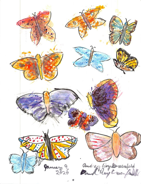 Daniel and I painted these butterflies with gouache, pastels, and a brush pen. Originally my intent was to experiment with butterfly shapes for republishing my butterfly book, but then I decided to play around with brush shapes and mark-making. Daniel joined in the fun of giving the butterflies their beautiful coloration with me.